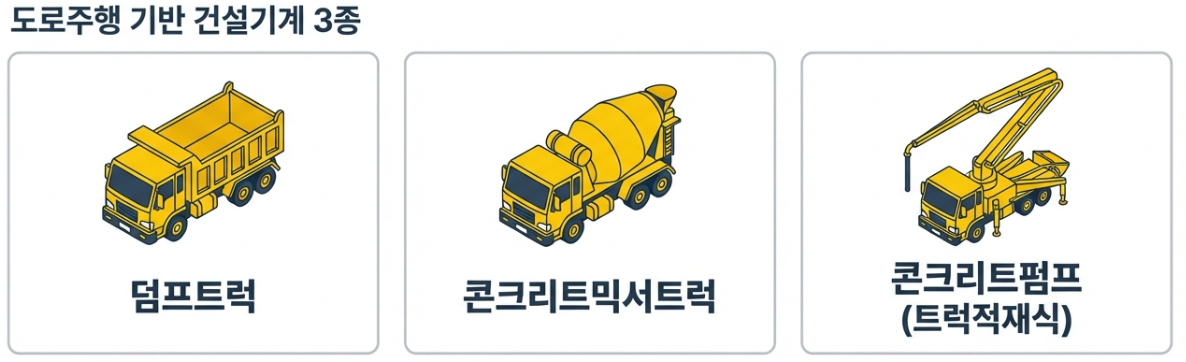 입고검사예약제 대상은 도로주행이 가능한 자동차 기반 건설기계입니다. 구체적으로는 덤프트럭, 콘크리트믹서트럭, 콘크리트펌프(트럭적재식) 등이 해당됩니다. 이러한 건설기계들은 검사시설을 갖춘 검사소에 직접 차량을 가져가서 검사를 받아야 하는 '입고검사' 대상이기 때문에, 예약제의 혜택을 바로 누리실 수 있습니다.